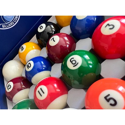 This set of 16 billiard balls resemble big, round pieces of hard candy. They are regulation size, 2-1/4 in diameter, and weigh 4-1/4 oz. It is good for a family use.